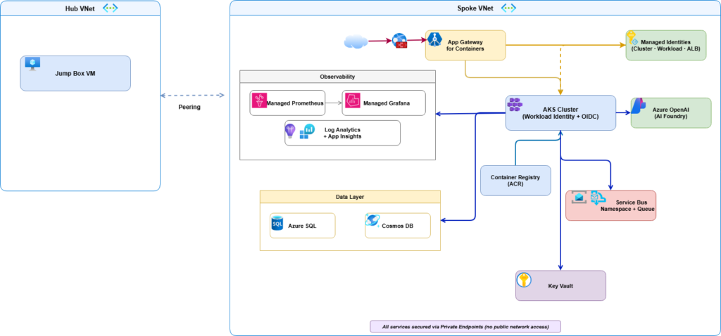 - Azure Monitor stack with Application Insights, Log Analytics, Managed Prometheus, and Managed Grafana.