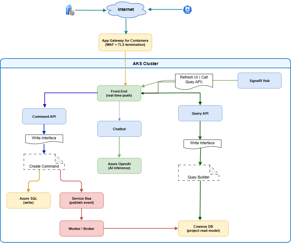 At runtime, the front-end sends create/update/delete actions to the Command API. After successful persistence to Azure SQL, events are published to Azure Service Bus. A broker/worker service consumes those events and updates read projections in Cosmos DB. Query APIs then serve these projections, while SignalR pushes updates to connected clients. The chatbot service handles conversational requests by calling Azure OpenAI.